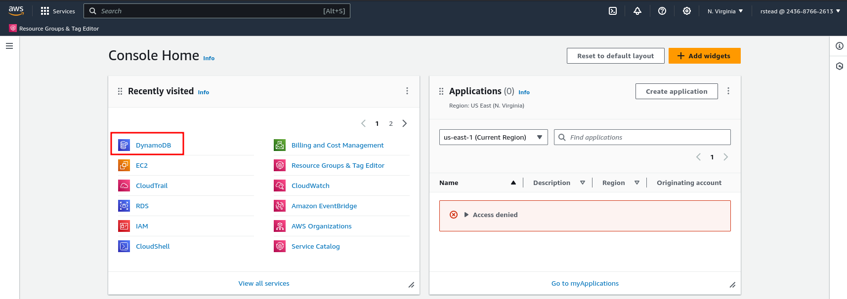We then proceed to the AWS Console and log in with the credentials that we have found and are able to login and can see that the user has recently visited DynamoDB