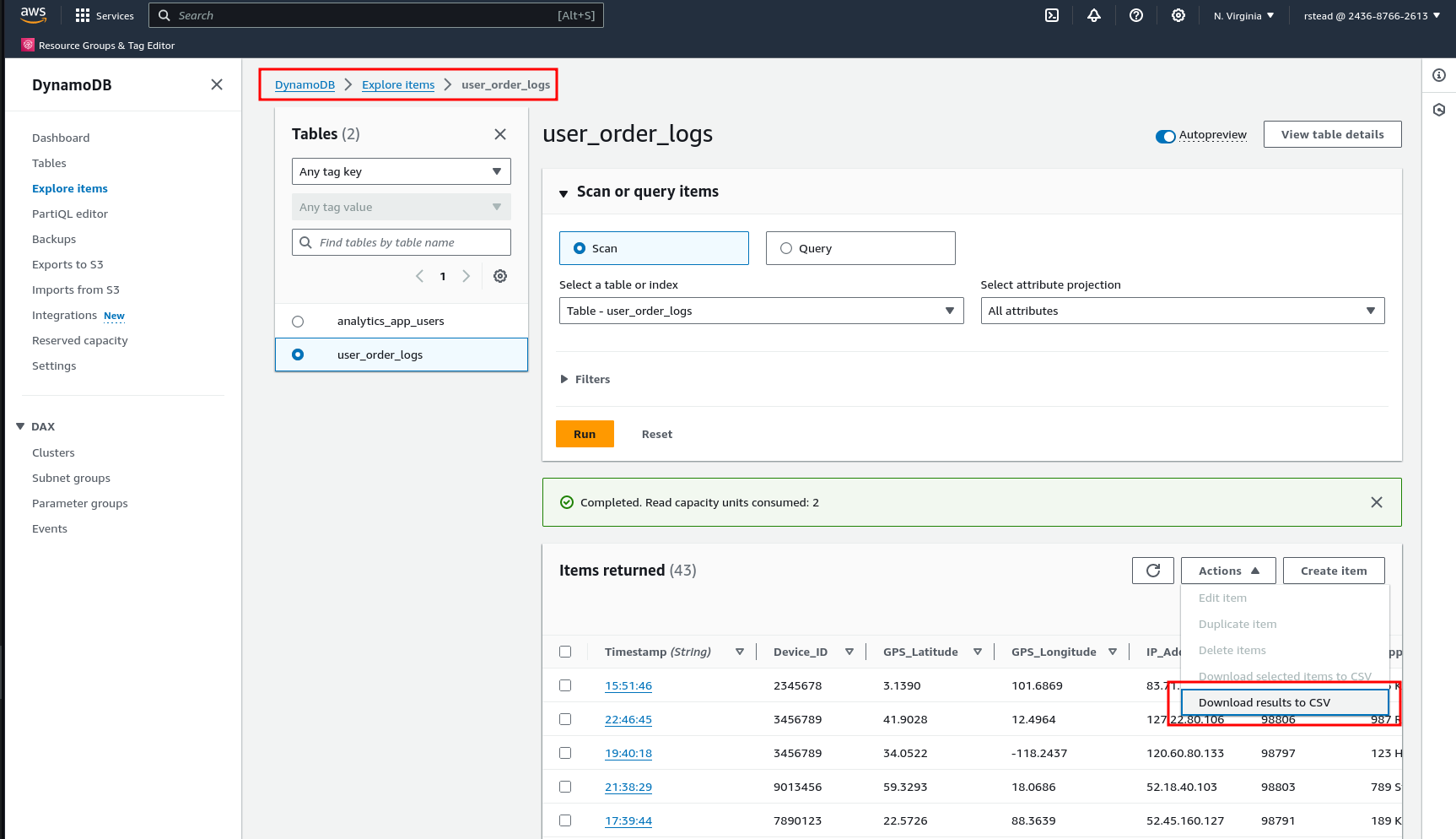 We got a hit on DynamoDB and shall enumerate that further and can see to Tables, analytics_app_users and user_order_logs