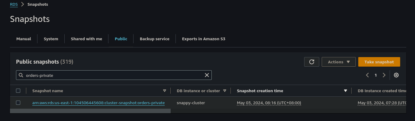 You can see that this reveals a RDS cluster snapshot name orders-private. We will login to our AWS console and then navigate to RDS -> Snapshots -> Public and filter for "orders-private"