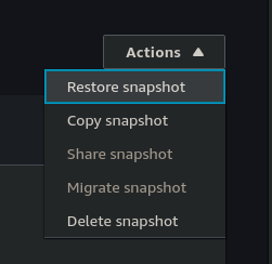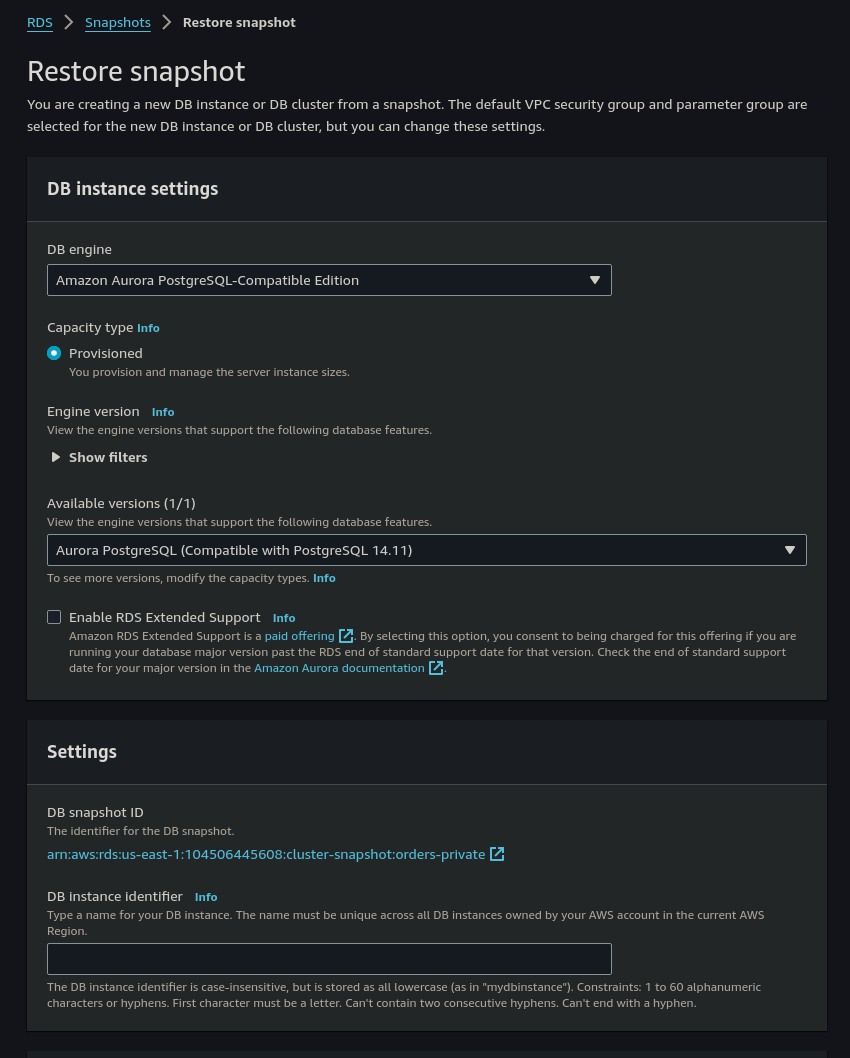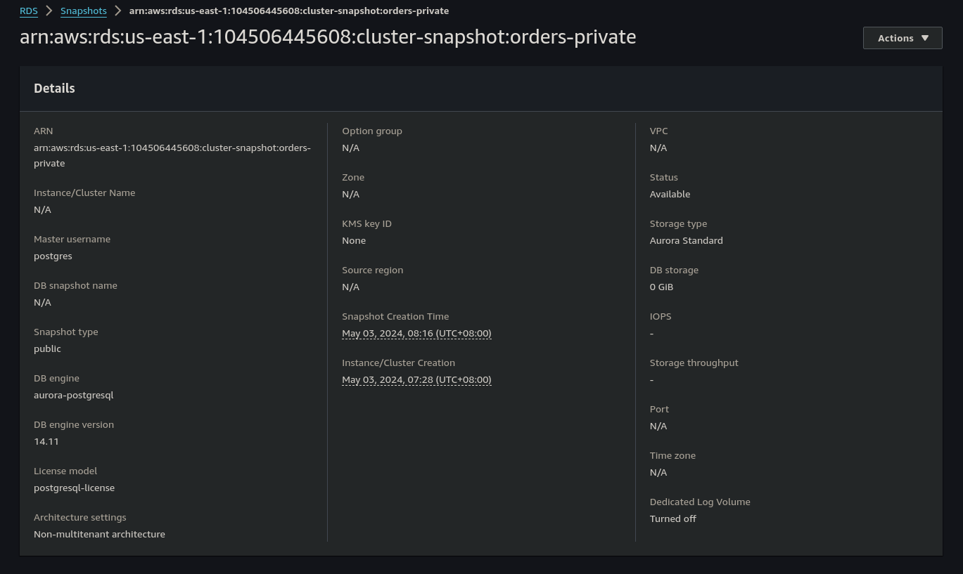 "DBClusterSnapshotIdentifier": "arn:aws:rds:us-east-1:104506445608:cluster-snapshot:orders-private",