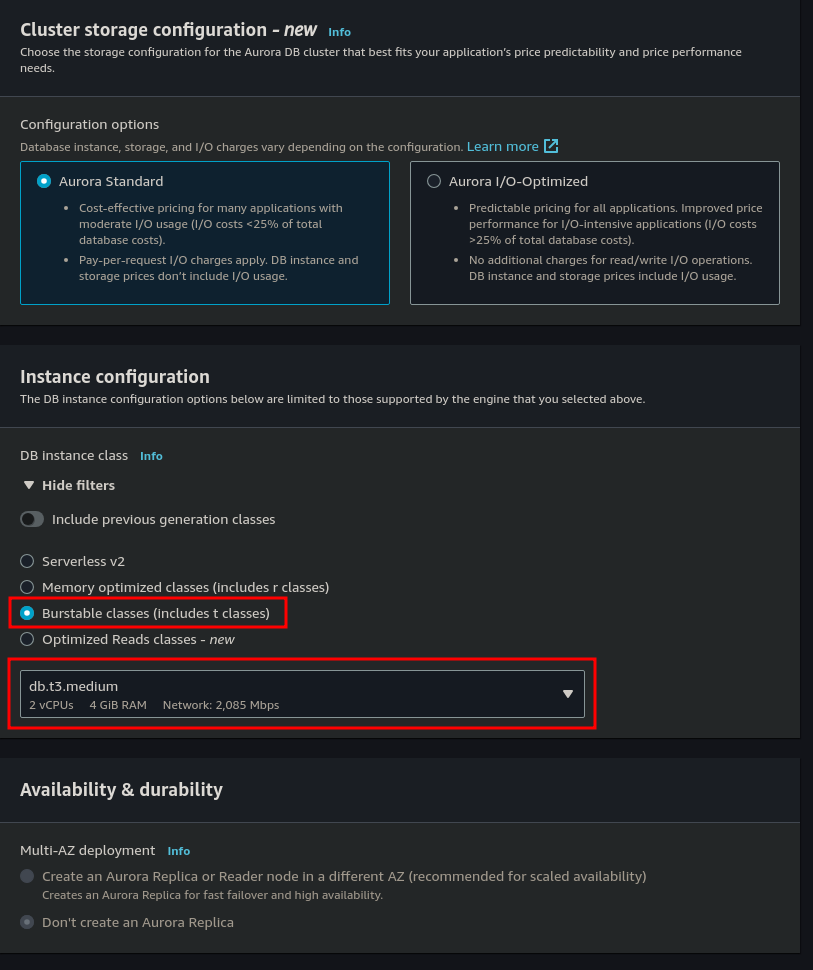 Under Instance Configuration, select Burstable classes (includes t classes) and then make sure that db.t3.medium is selected.