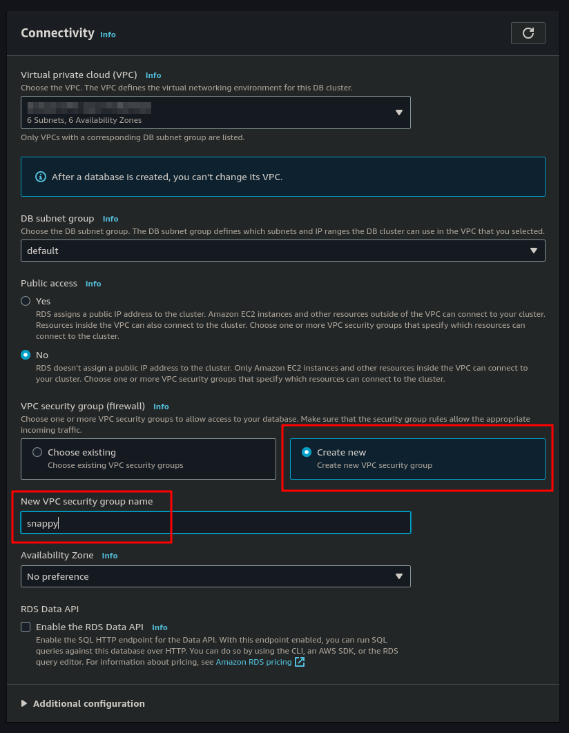 Under Connectivity ensure that Public Access is set to No and choose the option to create a new Security Group which we will call snappy