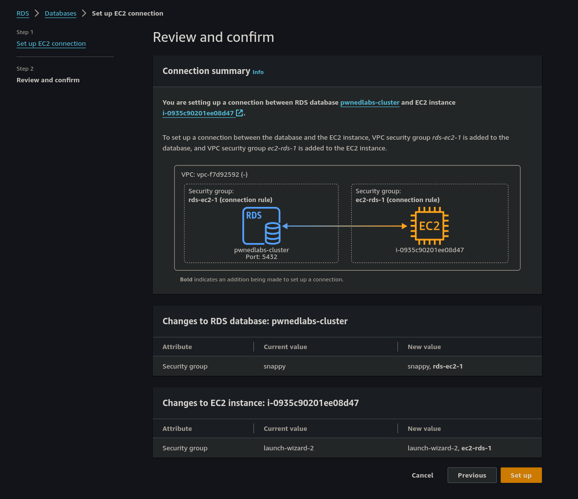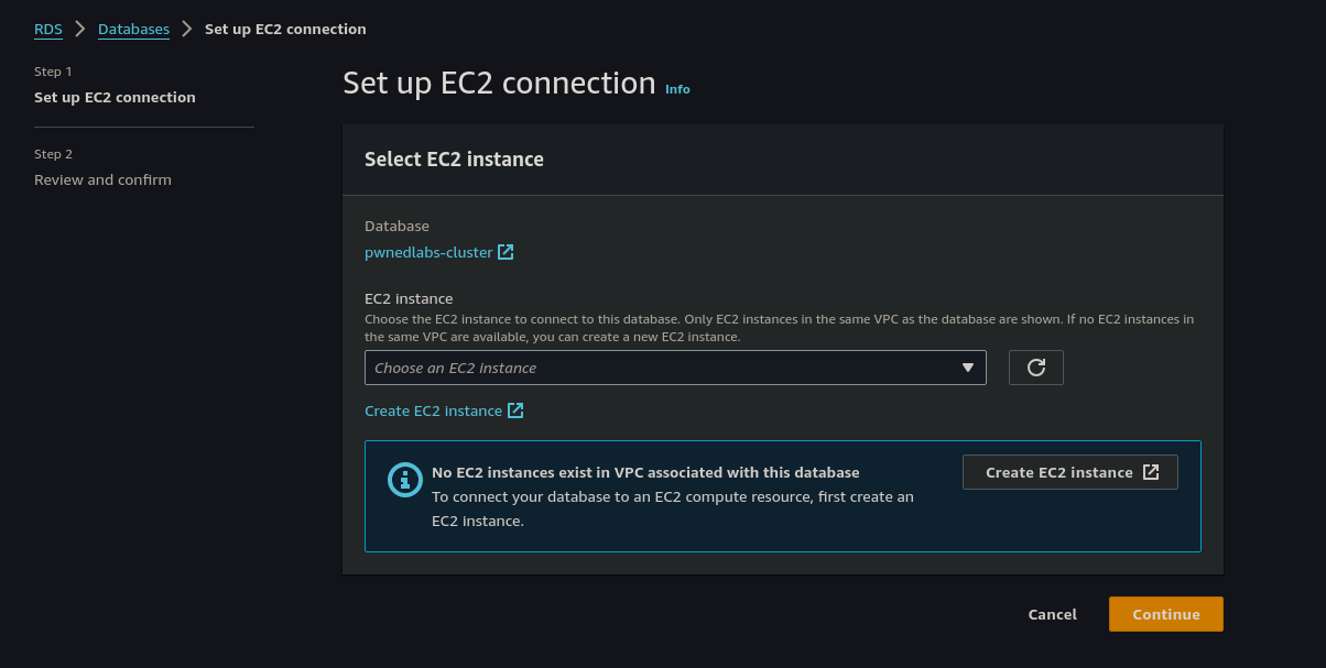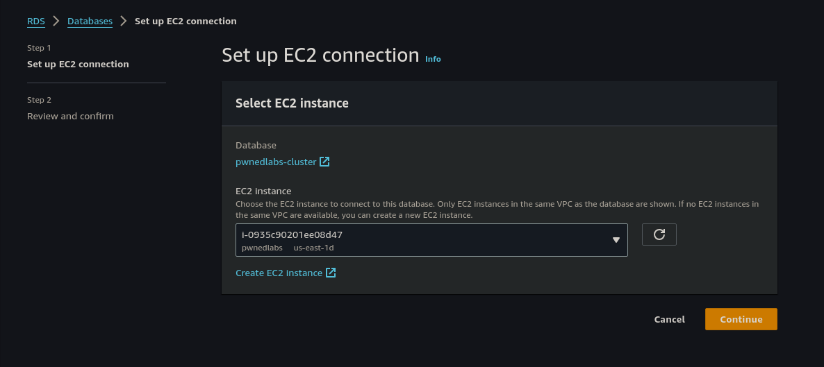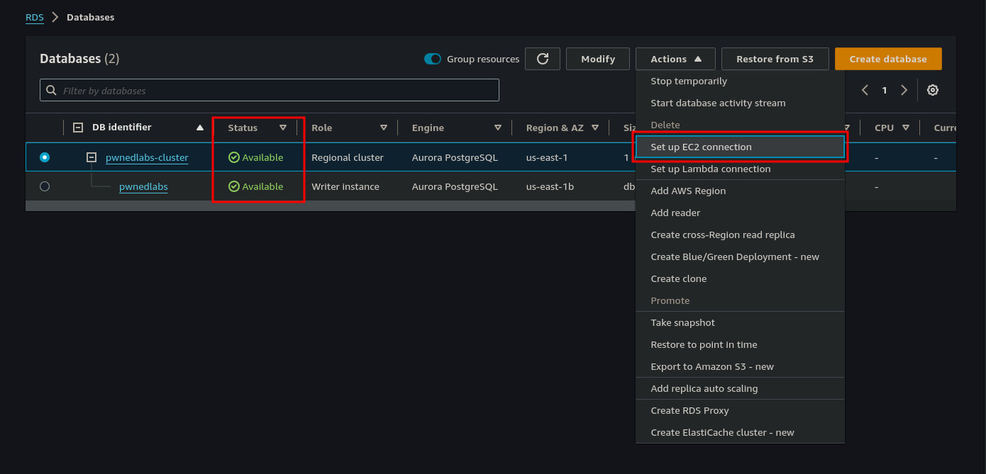 Once the database cluster is restored and the status shows "Available", we select pwnedlabs-cluster and from the Actions drop-down menu select Set up EC2 Connection.