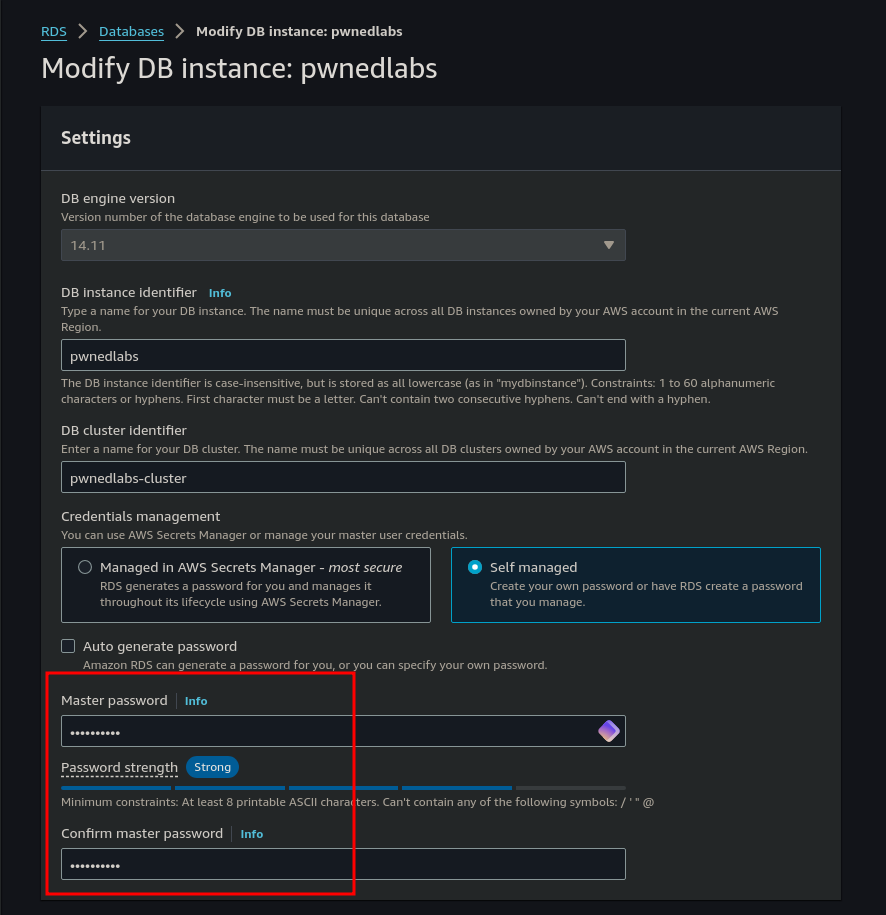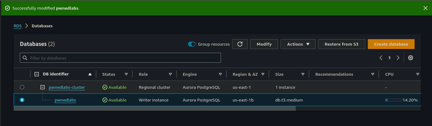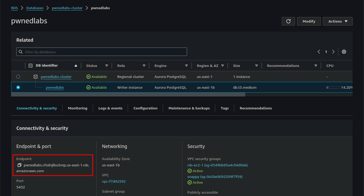 [ec2-user@ip-172-31-2-135 ~]$ psql -h pwnedlabs.cfzdnjlbu5mp.us-east-1.rds.amazonaws.com -U postgres