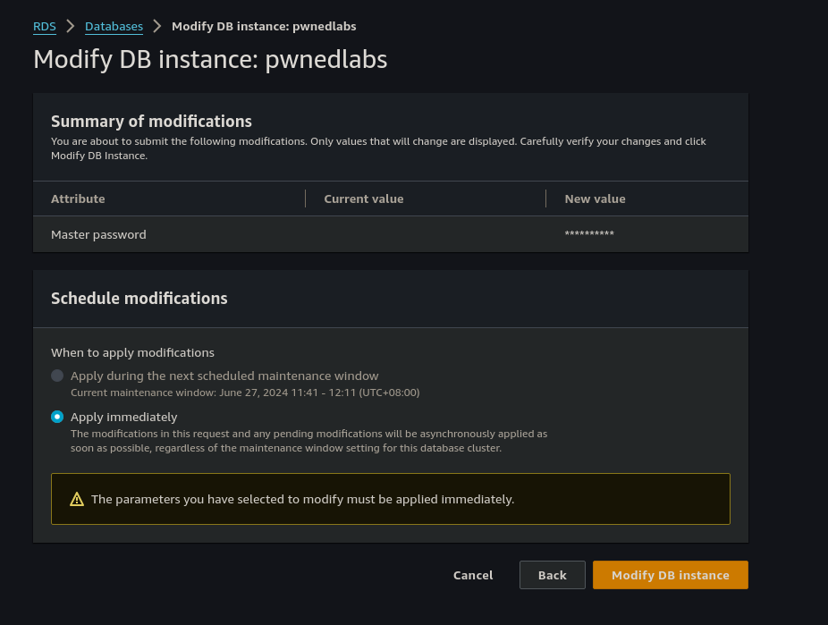 Confirm that the Apply immediately radio button is selected and then click Modify DB Instance and await for confirmation.